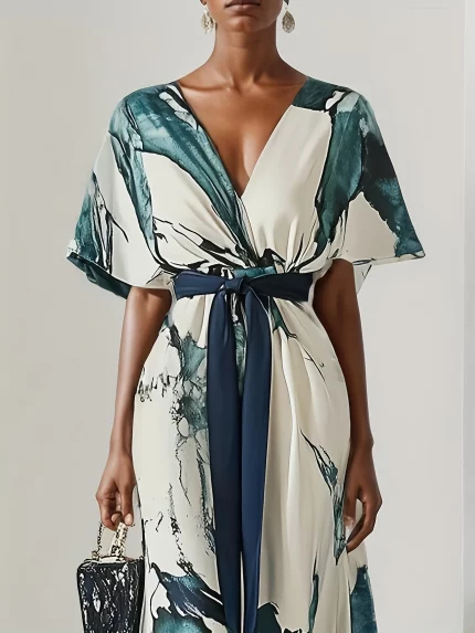 Alofi Women’s 2025 Summer Watercolor Print Maxi Dress – V-Neck Lace-Up Waist Material: Polyester Length: Long length Belt: No Sleeve
